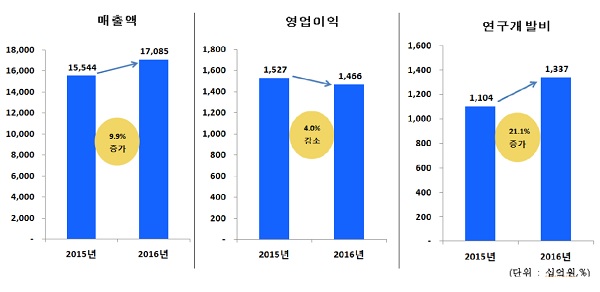 제약기업의 연구개발비는 전년 대비 21.1% 증가한 1.3조원이고, 매출액 대비 연구개발비 비중도 7.8%로 2015년(7%)보다 상승했다.