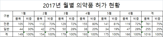 올해 의약품 허가 현황을 월별로 살펴보면 1월 149품목(전문 105품목, 일반 44품목), 2월 154품목(전문 112품목, 일반 42품목), 3월 179품목(전문 129품목<희귀 1품목>, 일반 50품목<희귀 1품목>), 4월 193품목(전문 155품목<희귀 2>, 일반 28품목), 5월 175품목(전문 141품목, 일반 34품목), 6월 166품목(전문 119품목, 일반 47품목) 등이다.