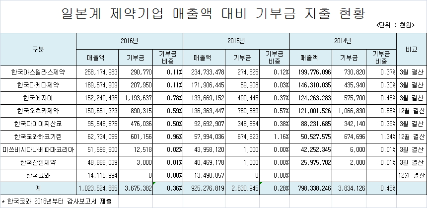 일본계 제약기업들은 최근 2014년부터 2016년까지 기간중 2015년에 기장 적은 기부금을 지출했던 것으로 파악됐다. 매출액의 평균 0.28%인 36억 3,000만원만 사회 공헌기금인 기부금으로 지출했던 것.