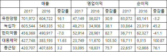 순이익=순이익 증감률은 대웅제약이 100.87%로 가장 높았고 종근당도 76.1%로 큰폭 증가했다. 영업이익 부문에서 82.7% 증가한 한미약품은 41.1% 감소했고, 매출증가율 1위인 유한양행은 3.2% 감소했다.