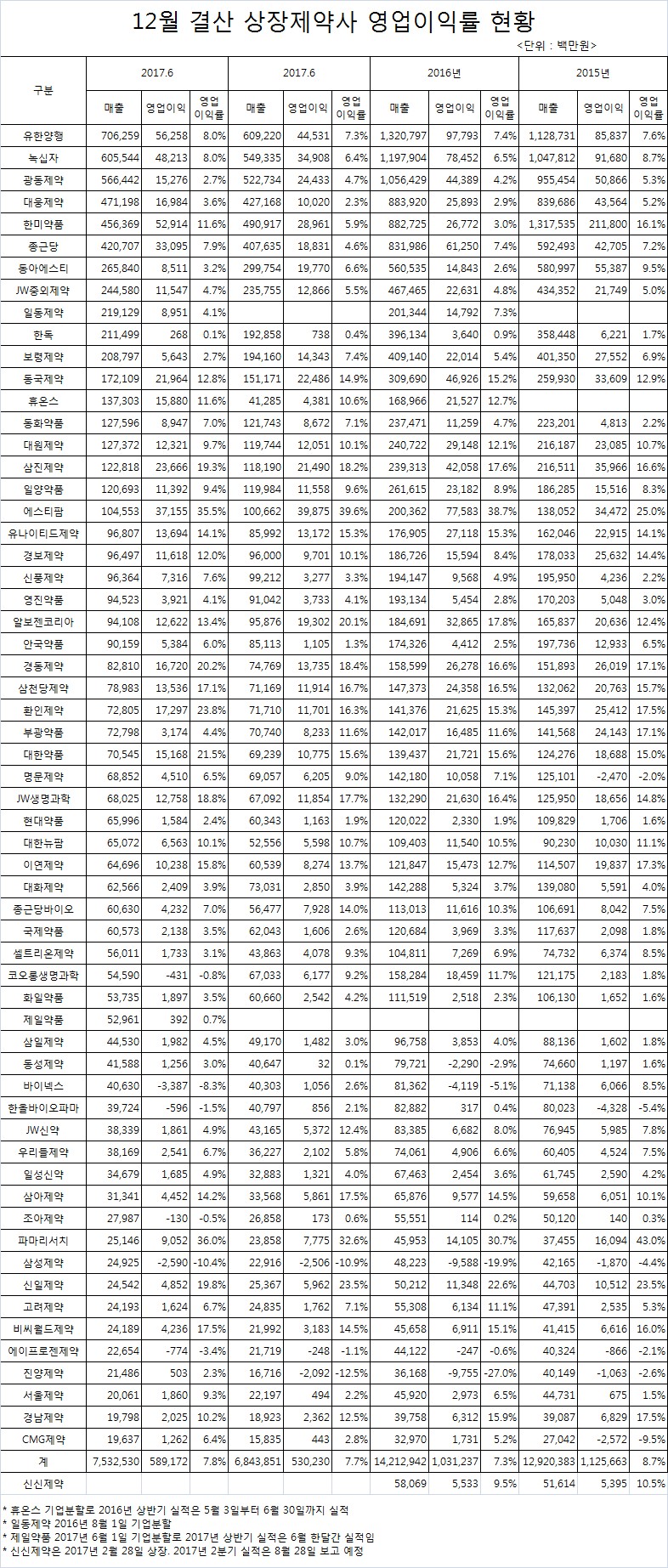 약업닷컴(www.yakup.com)이 12월 결산 상장 제약사의 2017년 상반기 영업이익률을 분석한 결과, 평균 7.8%로 집계됐다.(지주회사 및 바이오제약사 제외)