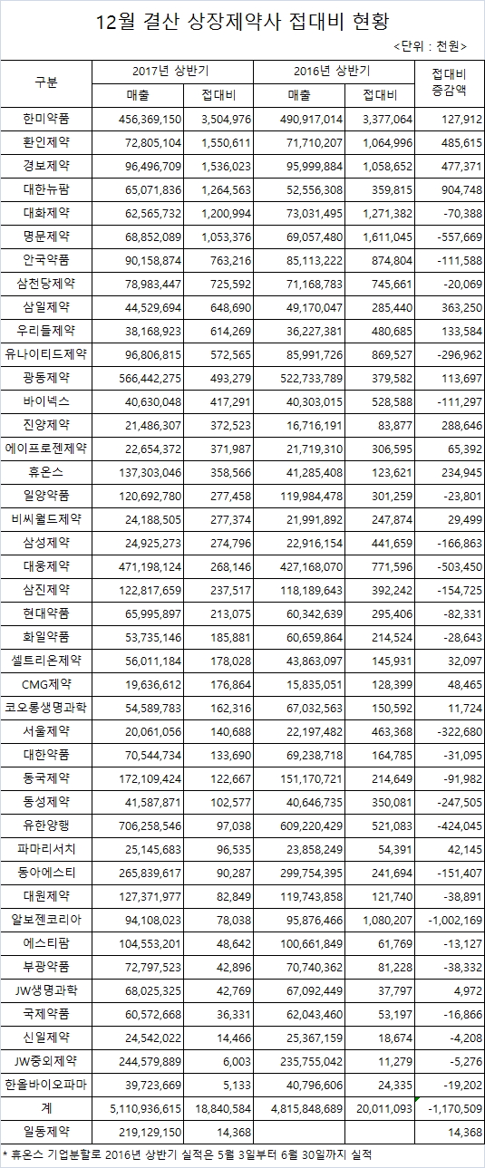 뒤를 이어 명문제약 -5억 5,800만원, 대웅제약 -5억 300만원, 유한양행 -4억 2,400만원, 서울제약 –3억 2,300만원, 유나이티드제약 -2억 9,700만원 등 지난해 상반기 대비 1억원 이상 접대비가 감소한 제약사는 12곳이었다.