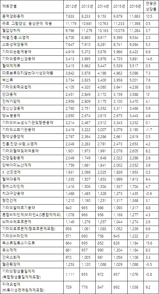 <2012년-2016년 약효군별생산실적(단위 억, %>