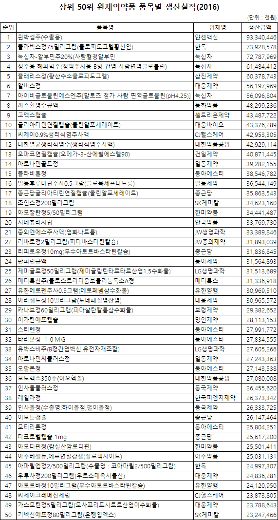 이외 한독(플라빅스정75밀리그램 739억 등, 2위) 씨제이헬스케어(씨제이0.9%생리식염주사액 429억 등, 11위) 에스케이케미칼생명과학부문(조인스정200밀리그람 346 등, 18위) 한미약품(아모잘탄정5/50밀리그램 344억 등, 19위) LG생명과학(제미글로정50밀리그램 315억 등, 25위) 유한양행(유한메로펜주사0.5그램 309억 등 , 27위) 동국제약(인사돌플러스정 264억등, 37위) 등 7개 제약사는 2개씩 랭크시켰다.