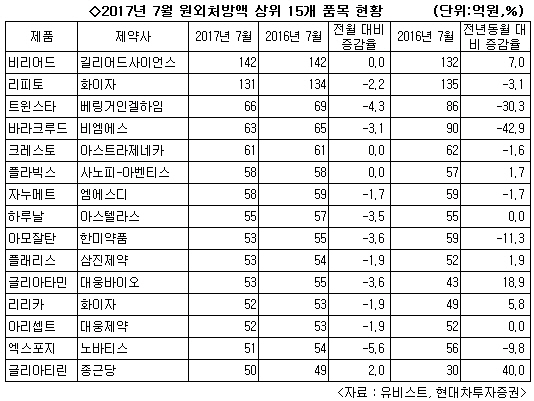 현대차투자증권이 유비스트 자료를 분석해 발표한 2017년 7월 원외처방 조제액 상위 15개 의약품 현황에 따르면 길리어드사이언스코리아의 만성 B형 간염 치료제 ‘비리어드’가 월간 처방액 142억원으로 1위, 화이자제약의 고지혈증치료제 ‘리피토’가 131억원으로 2위를 기록했다.