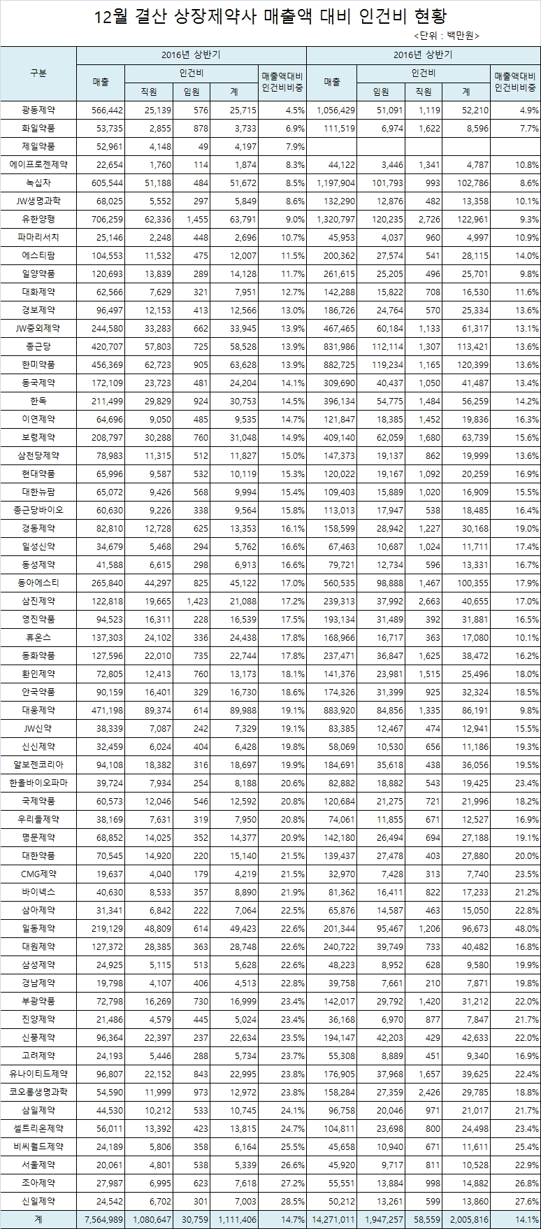 약업닷컴(www.yakup.com)이 12월 결산 상장제약 61개사의 2016년 상반기 영업실적을 분석한 결과, 매출액 대비 인건비 비중은 평균 14.7%로 집계됐다. (바이오제약사 및 지주회사 제외)