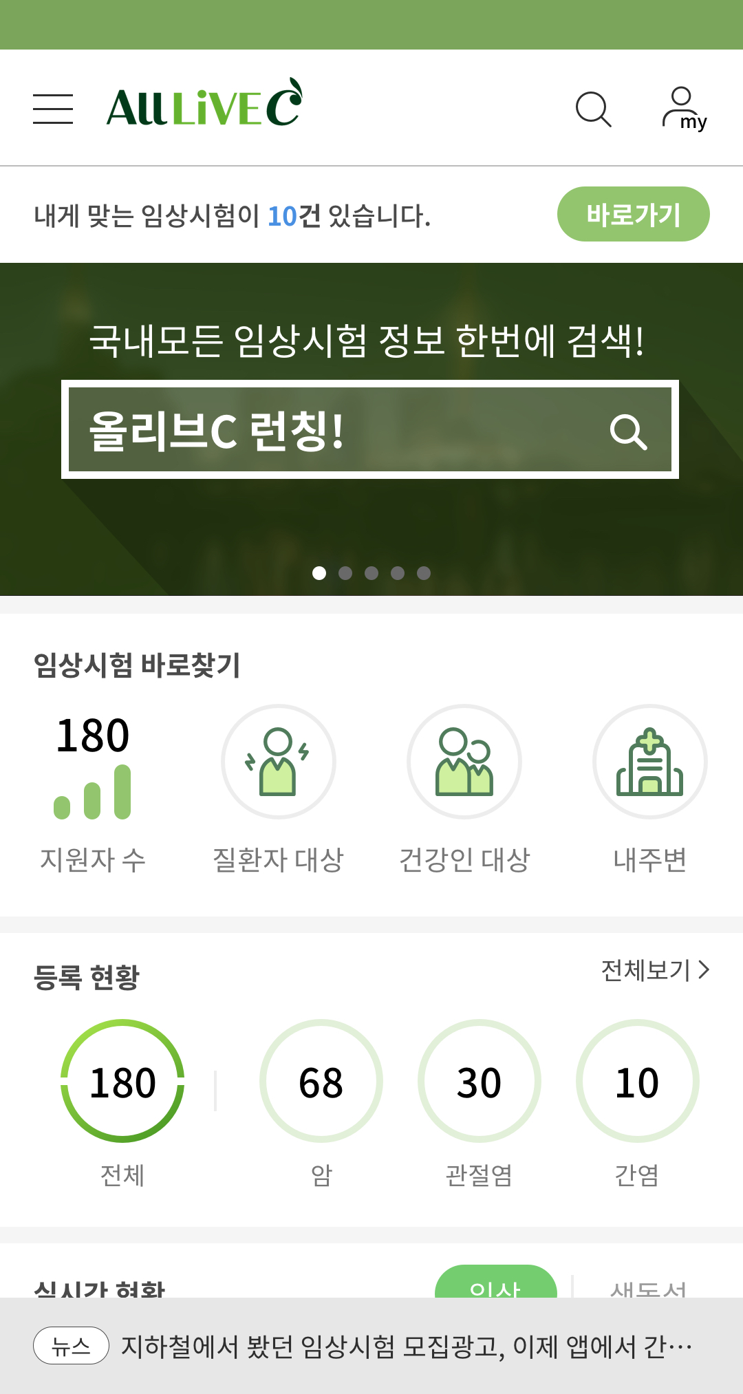 이와 함께 ‘올리브C’는 현재 제약사 임상시험을 중심으로 식약처 및 각 임상시험센터 임상윤리위원회(IRB)에서 승인한 정보를 모아서 제공하고 있다. 임상시험 정보를 한 번에 쉽게 볼 수 있어 신약개발 임상시험 정보에 목마른 ‘환자의 알권리’를 우선 충족시켜 주고 있다. 향후 생동성 시험을 비롯해 의료기기 분야까지 모든 임상시험 정보를 제공할 계획이다.