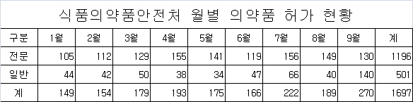 식품의약품안전처에 따르면 1월부터 9월까지 허가받은 의약품은 총 1,497품목이고, 이중 전문의약품은 1,196품목, 일반의약품은 401품목으로 집계됐다.