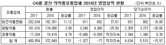 금융감독원에 보고된 6월 결산 의약품유통업체 3곳의 영업실적을 분석한 결과 총 매출은 7.51% 증가한 4,008억원, 영업이익은 13억원의 적자를 기록했으며, 순이익은 15.97% 줄어든 46억원을 기록했다.