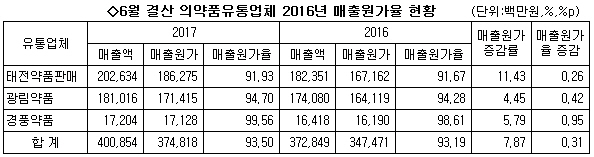 업체별 매출원가율을 살펴보면 경풍약품이 99.56%로 전년 보다 0.95%p 증가하며 매출에서 별 다른 수익을 얻지 못한 것으로 나타났고, 광림약품이 전년 보다 0.42%p 늘어난 94.70%의 매출원가율을 기록했다. 태전약품판매의 매출원가율은 91.93%로 지난해 보다 0.26%p 증가했다.