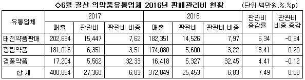 업체별 판매관리비 비중을 살펴보면 경풍약품이 매출의 32.33%인 55억원으로 판관비를 지출했고, 태전약품판매가 7.62%인 154억원, 광림약품이 3.51%인 63억원을 각각 판관비로 지출했다.