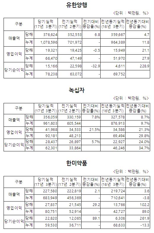 31일 현재 '톱5' 제약사 중 영업실적 발표를 하지 않은 대웅제약과 종근당을 제외한, '빅3'제약(유한양행 녹십자 한미약품, 올해 상반기 매출 기준)이 3분기 매출 영업이익 순이익 등 부문에서 전년동기(2016년 3분기) 보다 양호한 실적을 냈다.