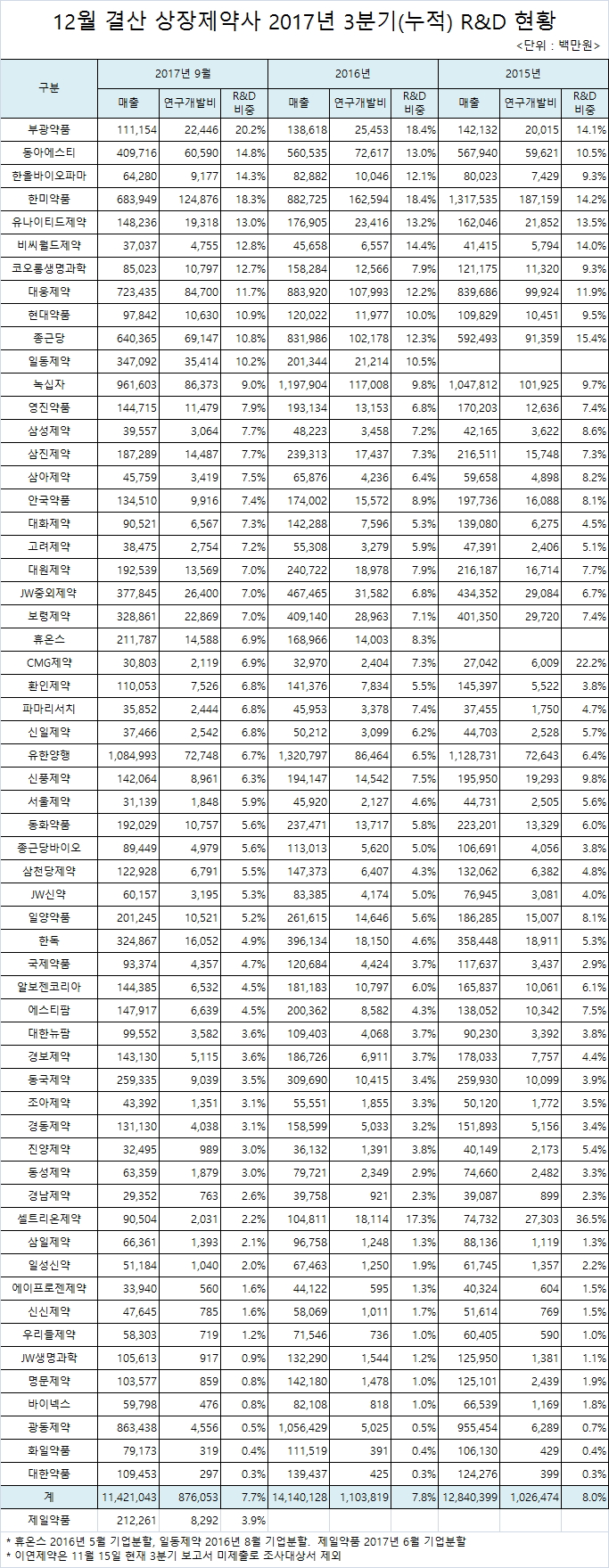 약업닷컴(www.yakup.com)이 12월 결산 코스피 및 코스닥 상장 제약사들의 2017년 3분기 영업실적을 분석한 결과, 매출액 대비 연구개발비 투자 비중은 평균 7.7%로 나타났다. <지주회사 및 바이오기업 제외>