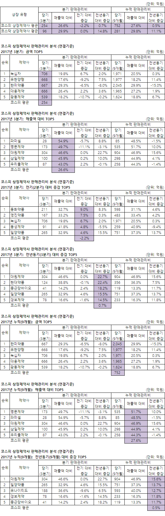 누적 판관비가 가장 많은 제약사는 코스피는 한미약품 코스닥은 동국제약, 매출액대비 누적 판관비가 가장 높은 제약사는 코스피는 명문제약 코스닥은 이수앱지스, 전년동기대비 누적 판관비 증감률이 가장 높은 제약사는 코스피는 대원제약, 코스닥은 휴온스로 각각 나타났다.