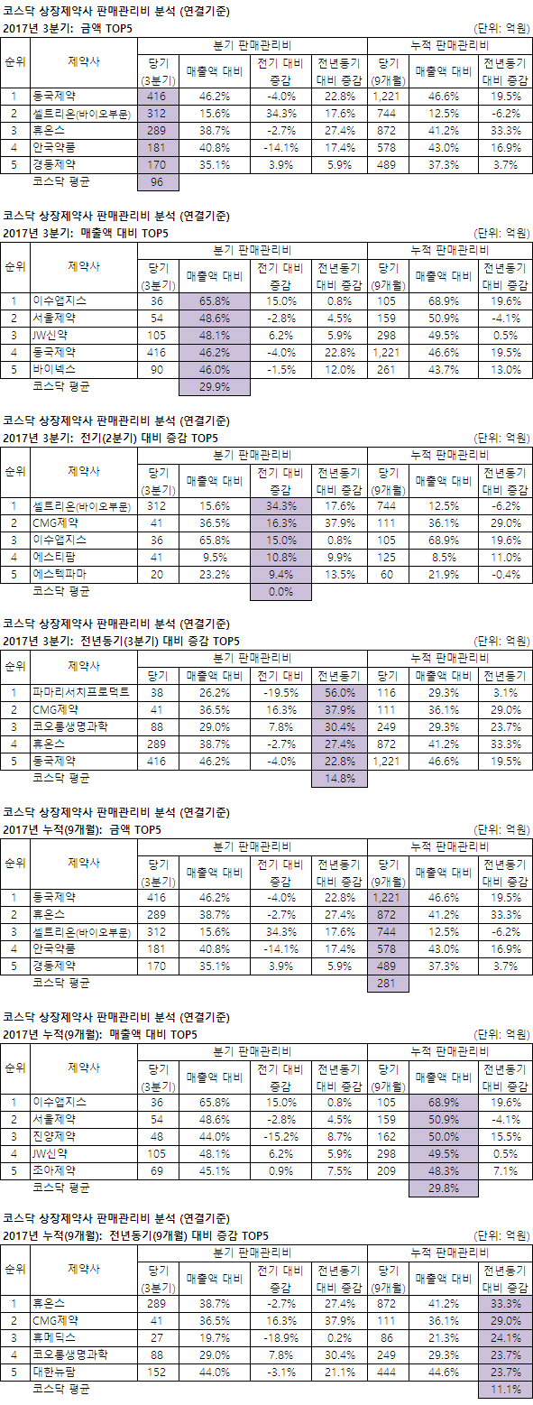 코스닥상장제약사(31곳):3분기= 판관비는 동국제약이 400억, 셀트리온(바이오부문)이 300억, 휴온스가 200억을 넘었다. 안국약품 경동제약이 '톱5'에 들었다(평균 96억)