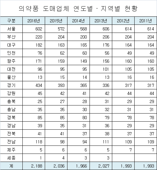 의약품관리종합정보센터에 따르면 2016년 기준 전국 의약품 도매업체는 2,188곳으로 2015년의 2,036개에 비해 152개 이상 증가한 것으로 나타났다.