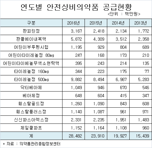 안전상비의약품중 가장 많이 팔린 품목은 해열진통제인 타이레놀 500mg으로 나타났다. 2013년부터 2016년까지 '타이레놀 500mg'의 편의점 등에 대한 공급액은 306억 2,800만원으로 집계됐다.