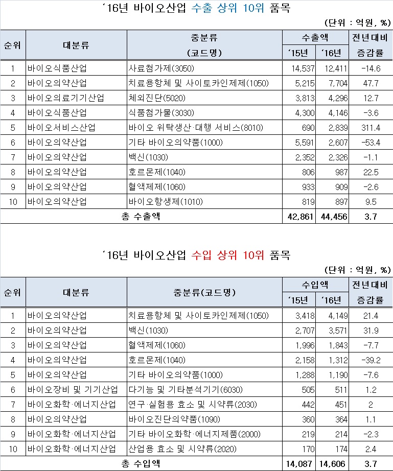 2016년 국내 바이오산업 수출은 4조 4,456억 원으로 전년대비 3.7% 증가했으며, 수입은 1조 4,606억 원으로 전년대비 3.7% 증가한 것으로 나타나, 2조 9,850억 원의 무역수지 흑자를 보였다.