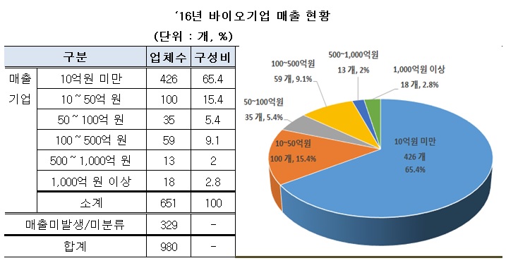 국내 바이오산업 실태조사 기업 980개중, 2016년 기준으로 매출이 발생한 기업은 651개로 2015년 645개 대비 소폭 증가했다.