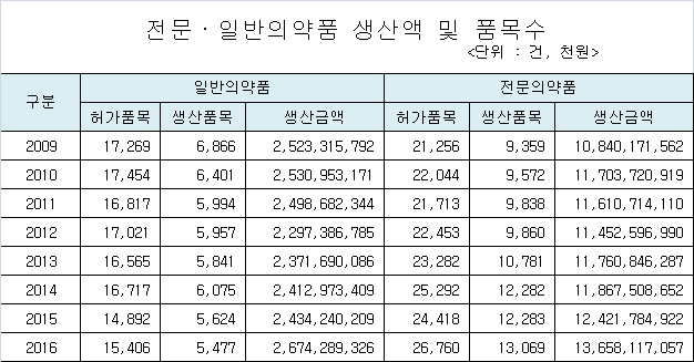 전문의약품은 2013년 생산품목이 1만개를 넘은 이후 지난해 1만 3,069품목으로 늘어났다. 생산금액은 2009년 10조840억에서 지난해는 13조6천518억원으로 증가했다.