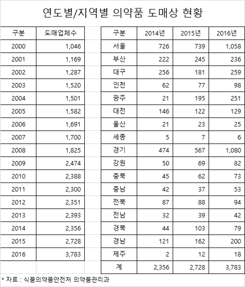 식품의약품안전처가 최근 발간한 '2016 식품의약품통계연보'에 따르면 2016년말 전국 의약품 도매업체는 3,783개소로 집계됐다.