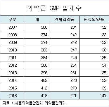 식품의약품안전처가 최근 발간한 '2017 식품의약품통계연보'에 따르면 2016년말 의약품 GMP를 인증받은 업체는 418곳으로 집계됐다.