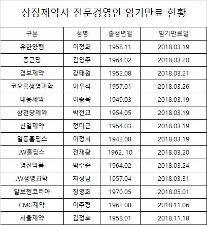 상장제약 전문경영의 임기는 대부분 3월 만료되지만 CMG제약 이주형, 서울제약 김정호 대표의 임기는 11월에 만료되는 것으로 나타났다.