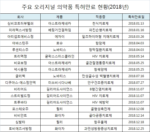 지난해 매출 200억대를 기록한 길리어드의 HIV 치료제 '스티리빌드'도 11월 7일 만료된다.
