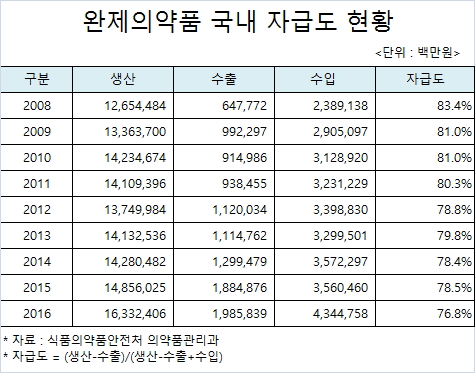 완제의약품 국내 자급도 현황은 점차 낮아지고 있는 것으로 조사됐다. 2008년 완제의약품 국내 자급도는 83.4%였으나 지속적으로 감소해 2016년에는 76.8%까지 떨어졌다.