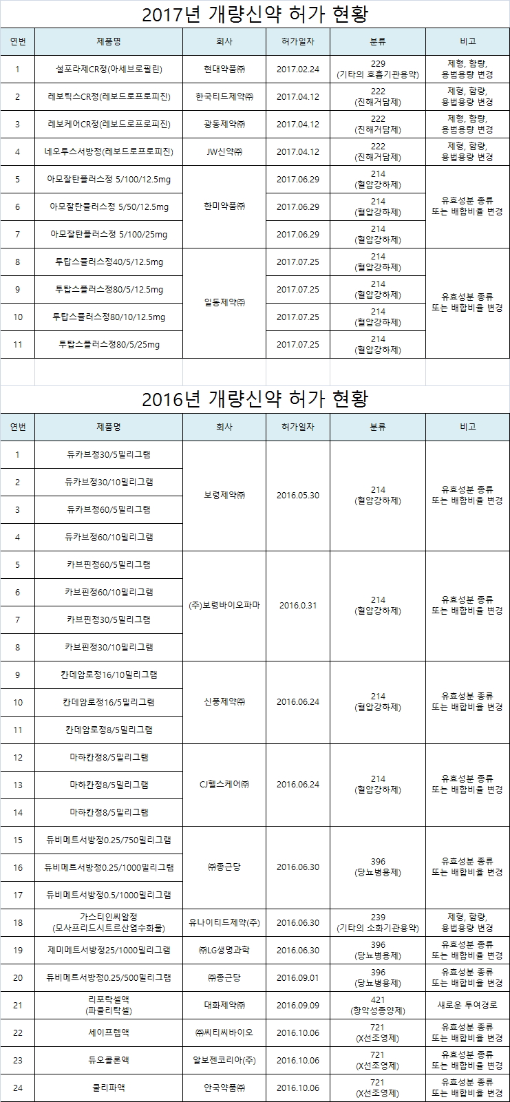 식품의약품안전처에 따르면 지난해 허가한 개량신약은 11품목으로 2016년의 24품목에 비해 절반이상 줄어들었다.