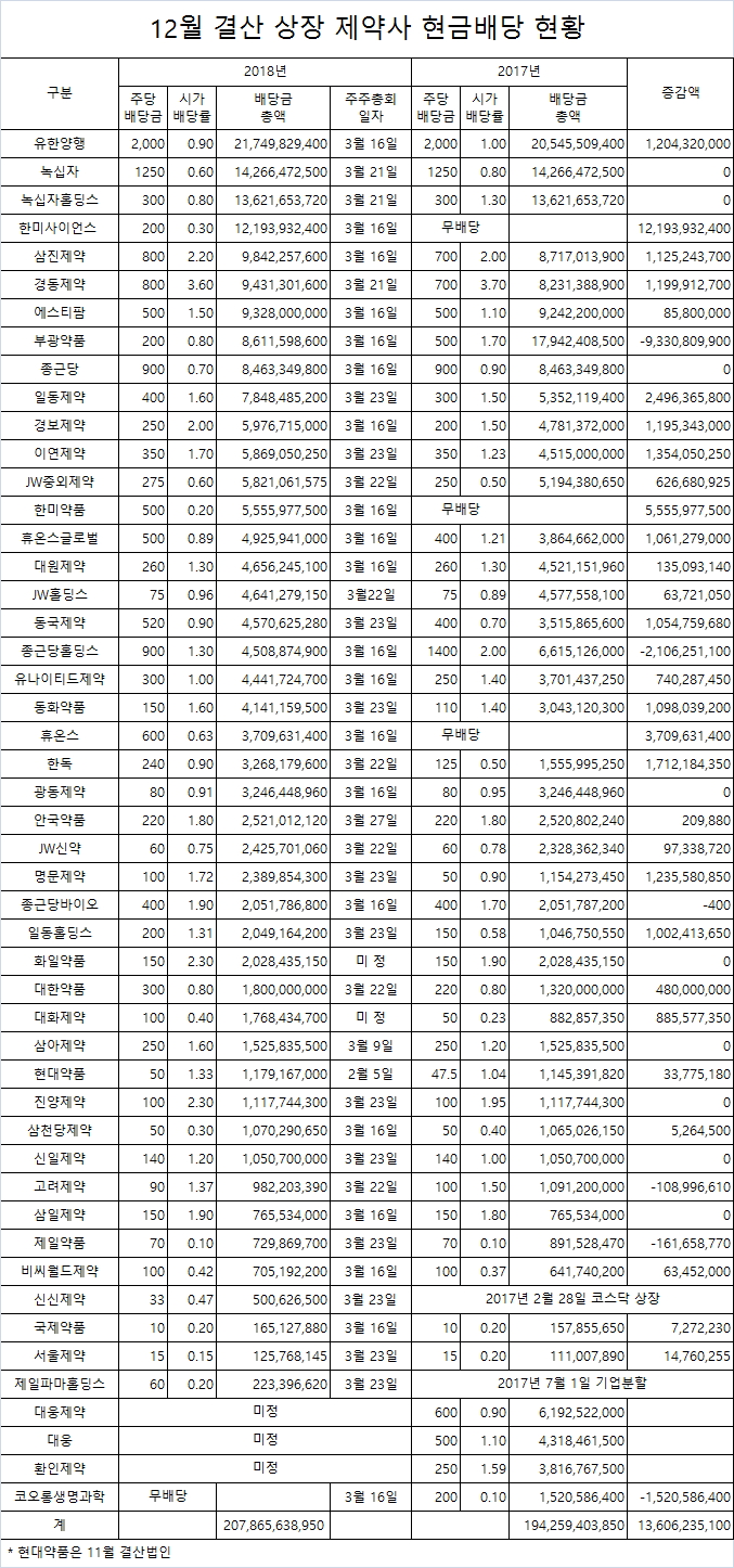 약업닷컴(www.yakup.com)이 12월 결산 코스피 및 코스닥 상장제약사들이 3월 주주총회를 앞두고 의결한 현금배당 현황을 집계한 결과, 45개 제약사가 2,079억대의 현금배당을 실시하는 것으로 나타났다.(2월 28일 기준, 바이오업체 제외)