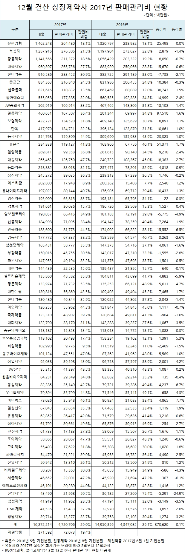 상장제약사중 명문제약은 매출액 대비 판매관리비 비중이 53.5%로 가장 높았다. 뒤를이어 진양제약 50.5%, 삼아제약 46.9%, JW신약 48.5%, 대원제약 47.7%, 조아제약 47.7%, 서울제약 47.2%, 동구바이오제약 47.0%, 바이넥스 46.1%, 동국제약 44.9%, 우리들제약 44.8% 등 매출액 대비 판매관리비 비중이 40%를 넘는 제약사는 총 20개사였다.