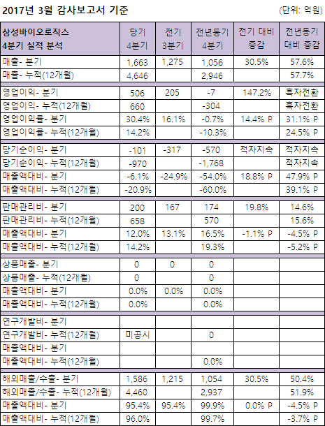 삼성바이오로직스는 3월 감사보고서 기준 지난해 4,646억원의 매출을 달성, 전년동기대비 57.7% 성장했다.