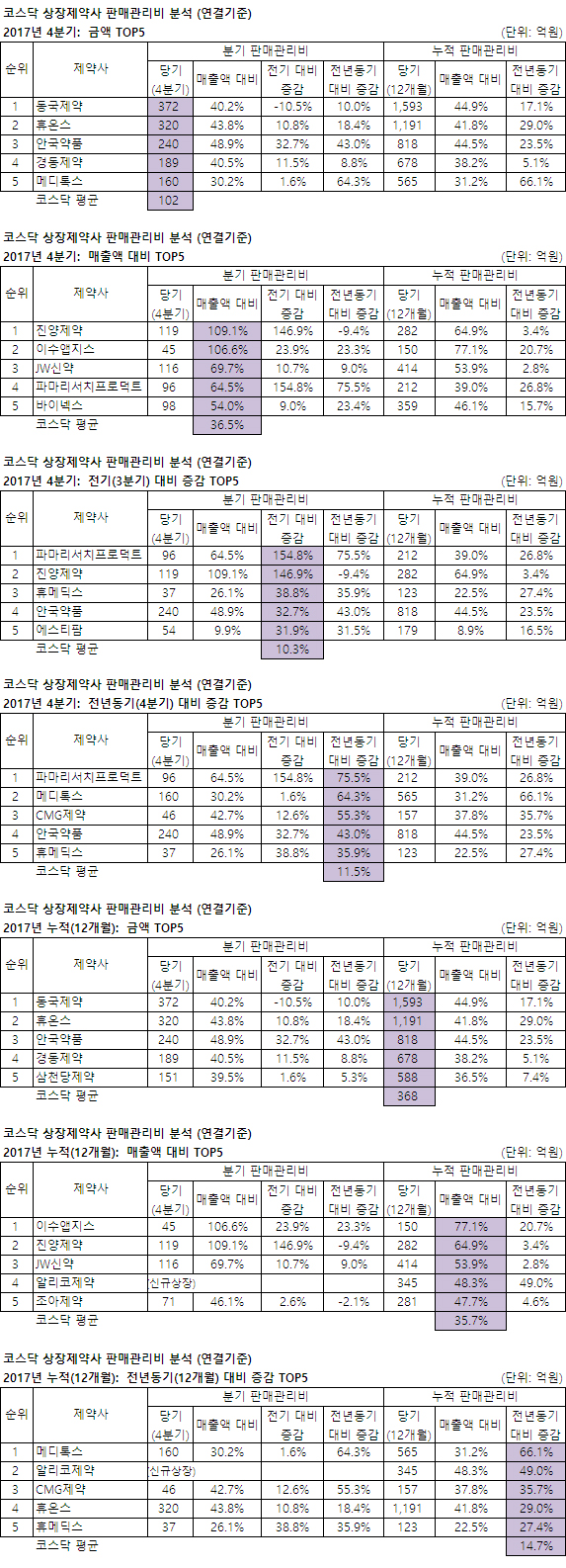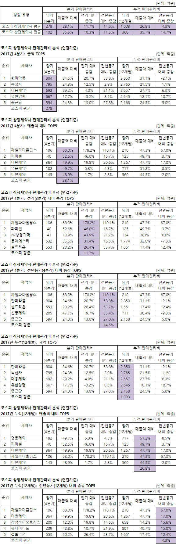 4분기(전년비): 제일파마홀딩스는 56억 증가(지급수수료 49억 증가), 한미약품은 298억 증가(광고선전비 199억 증가), 셀트리온은 193억 증가, 신풍제약은 51억 증가(대손상각비 26억 증가, 판촉비 16억 증가), 종근당은 129억 증가(광고선전비 52억 증가, 급여 복리후생 40억 증가)했다.