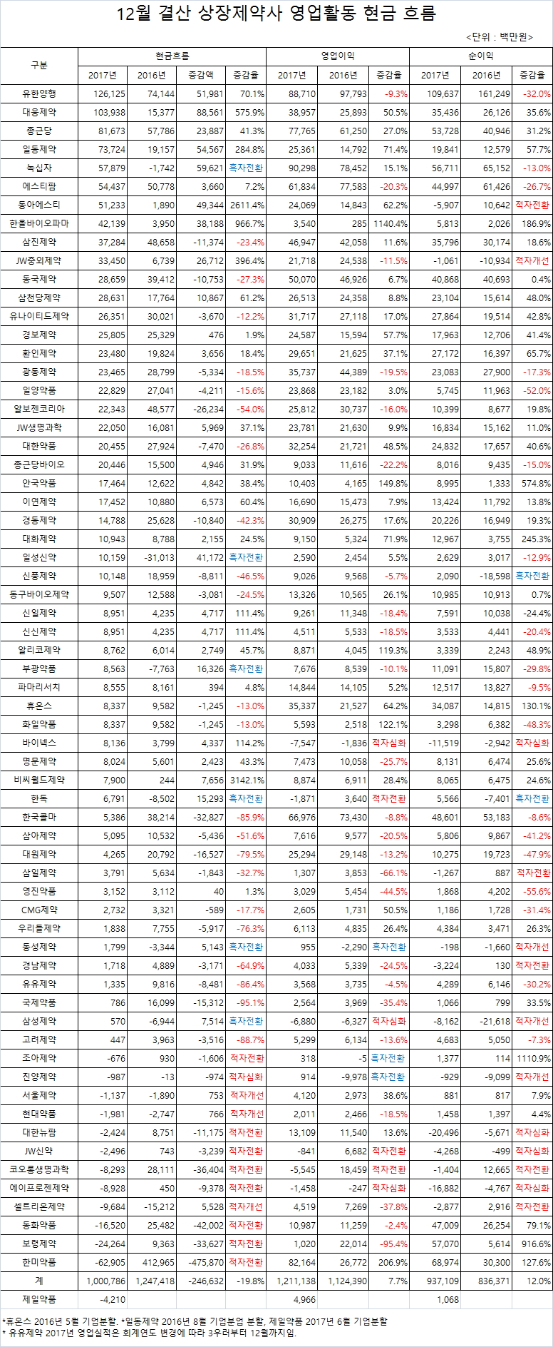 이들 중 셀트리온제약, 현대약품, 서울제약 등 3개사는 2016년에 이어 지난해도 현금유출액이 유입액보다 많았다.
