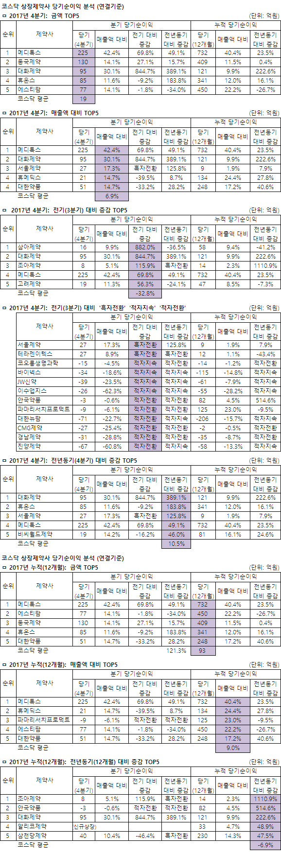 제약사별(4분기, 전기비) : 삼아제약은 14억 증가(법인세 10억 감소), 대화제약은 85억 증가(관계기업투자주식처분이익 81억 증가), 조아제약은 4억 증가(법인세 6억 감소), 메디톡스는 92억 증가(영업이익 87억 증가), 고려제약은 7억 증가(영업이익 11억 증가)했다.