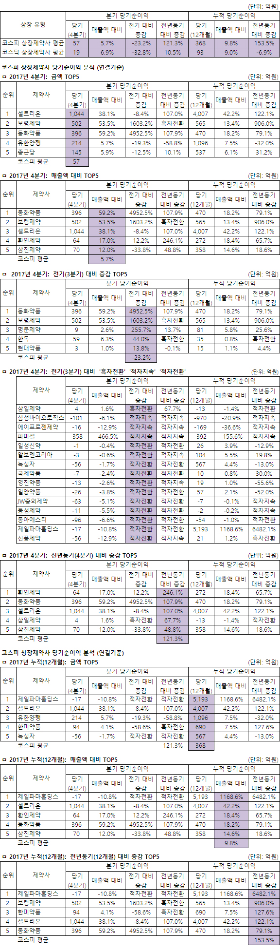 4분기(전년비): 환인제약은 46억 증가(금융자산처분이익 45억 증가), 동화약품은 206억 증가(유형자산처분이익 증가), 셀트리온은 540억 증가(영업이익 826억 증가), 삼일제약은 2억 증가(법인세 감소), 삼진제약은 23억 증가(금융자산손상차손 25억 감소)했다.