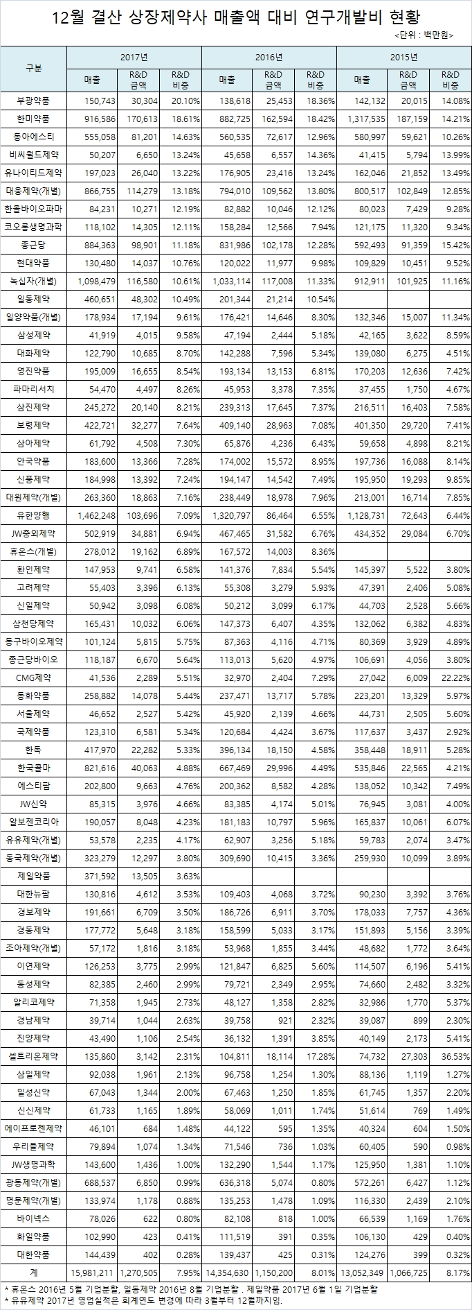 상장제약사들의 연도별 대비 평균 연구개발비 비중은 2015년 8.17%였으나, 2016년 8.01%, 2017년 7.95%로 낮아지고 있다.