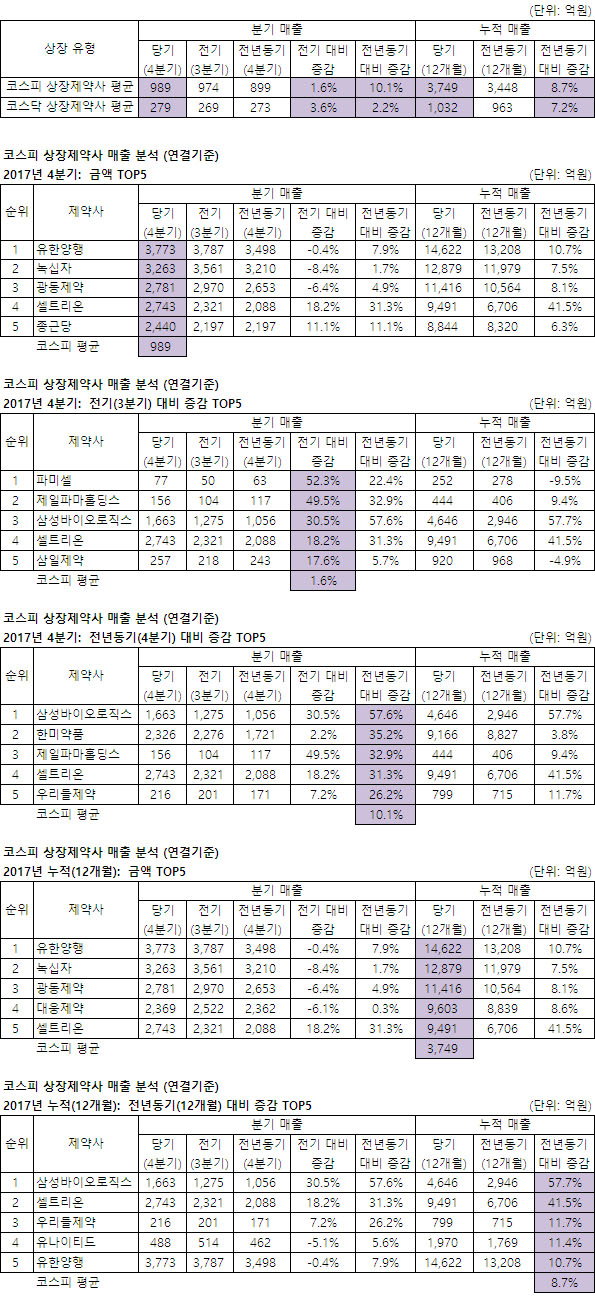 4분기(전년비) : 삼성바이오로직스는 608억 증가(유럽 511억 증가), 한미약품은 606억 증가(기술수출수익 606억 증가-제넨텍 계약금 분할인식, 사노피 계약금 반환 건 2016년 4분기), 제일파마홀딩스는 39억 증가(OTC부문 증가), 셀트리온은 654억 증가(바이오부문 559억 증가), 우리들제약은 45억 증가(상품매출 31억 증가)했다.