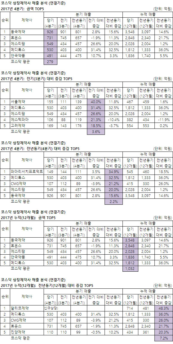전년동기대비 증감률은 파마리서치프로덕트와 메디톡스가 30%를 넘으며 1,2위를 차지했고 CMG제약과 에스티팜이 20%를 넘었다. 동국제약이 15.6%로 5위에 올랐다(평균 2.2%)