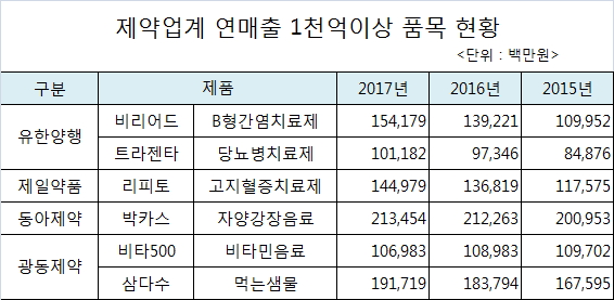 매출 1,000억을 넘는 품목은 의약품이 3품목, 의약외품 1품목, 기타 유통제품 2품목으로 집계됐다.