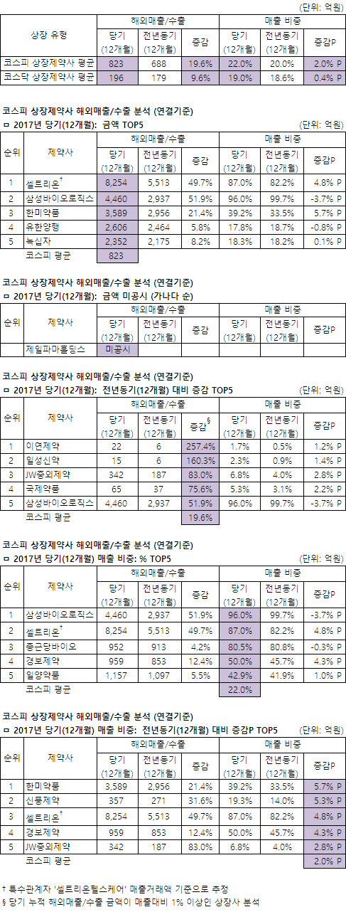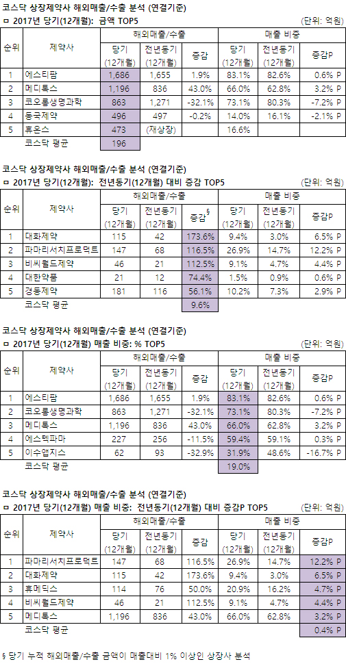 해외매출/수출액이 가장 많은 제약사는 코스피는 셀트리온 코스닥은 에스티팜, 전년동기대비 증감률이 가장 높은 제약사는 코스피는 이연제약 코스닥은 대화제약, 매출액 대비 비중이 가장 높은 제약사는 코스피는 삼성바이오로직스 코스닥은 에스티팜으로 각각 나타났다.