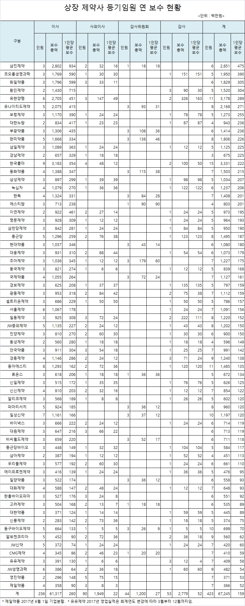 사외이사에게 보수를 가장 많이 지급하는 회사는 셀트리온제약으로 1인당 5천만원이었고, 뒤를 이어 유한양행 4,900만원, 대웅제약 4, 400만원, 광동제약 4,200만원 등이었다. 반면 동구바이오제약의 사외이사가 가장 적은 500만원을 받는 것을 비롯해 유유제약 동국제약 각각 600만원, 고려제약 700만원, 한올바이오파마 800만원 등 1,000만원 이하도 6개사였다.