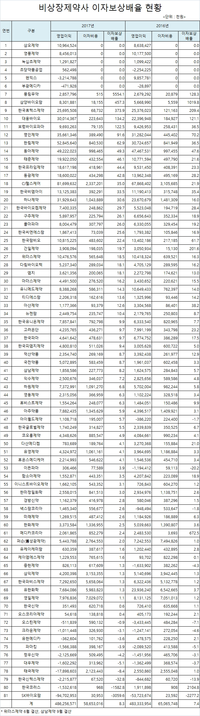 이들 이자보상배율이 1 미만인 제약사들은 영업활동에서 창출한 이익으로 이자비용조차 지불할 수 없기 때문에 잠재적 부실기업이라는 지적이다.