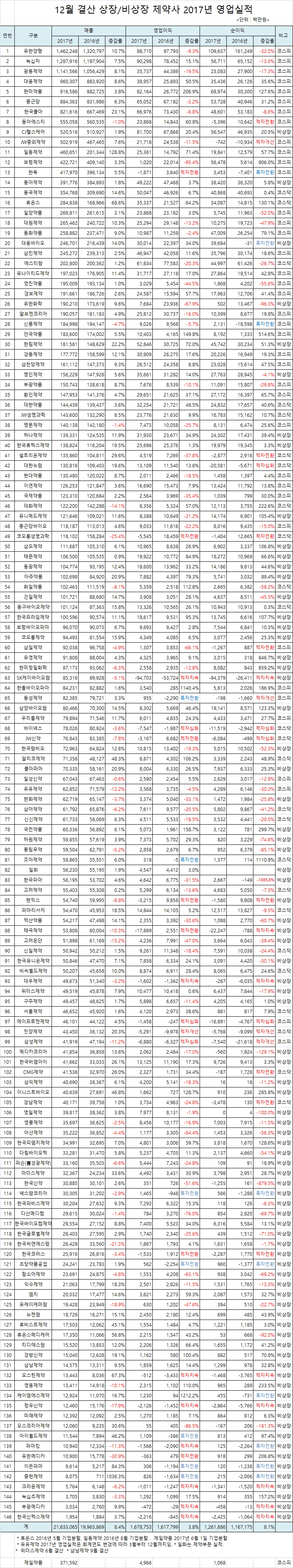 또 한화정밀화학이 순이익 증가율 859%를 기록한 것을 비롯해 유영제약, 국전약품, 이니스트바이오제약, 영동제약, 유한메디카, 녹십초제약, 한국피엠지제약, 삼양바이오팜, 한국프라임제약, 삼오제약, 유니메드제약 등 12개사의 순이익이 2016년 대비 100%이상 늘어났다.