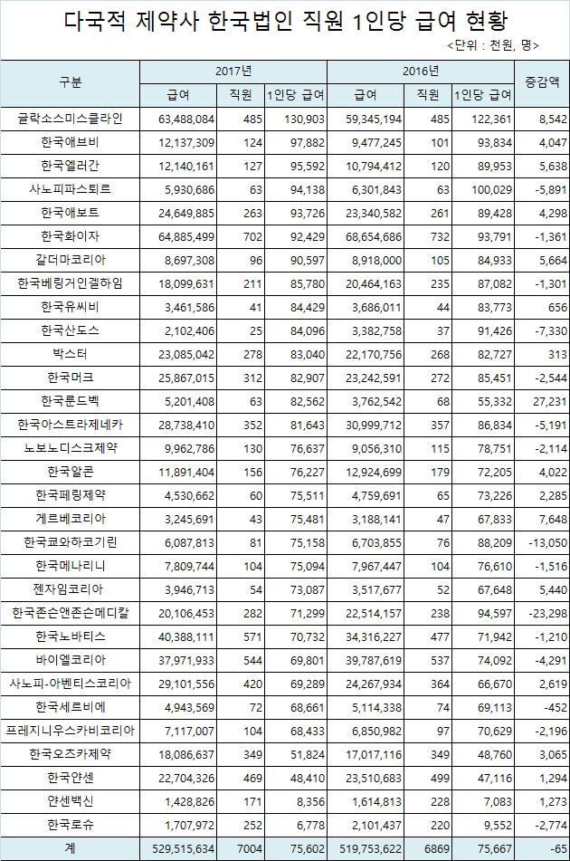 다국적 제약사 한국법인중 직원 연급여가 가장 많은 곳은 글락소스미스클라인으로 1억 3,100만원이었다. 2016년에 직원 1인당 연급여가 1억원을 넘었던 사노피파스퇴르는 9,400만원대로 급여가 하락했다.