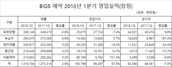 제약업체간 영업실적은 엇갈렸다. 유한양행은 Big5 제약사중 유일하게 매출이 줄었다. 2017년 1분기와 비교해 매출이 3.8% 감소했고, 영업이익도 7.4% 줄었다.