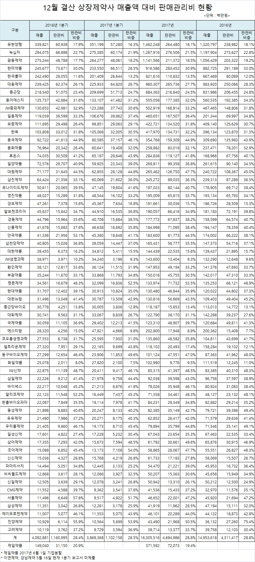 상장 제약사중 매출액 대비 판매관리비 비중이 가장 낮은 업체는 화일약품으로 8.0%%였고, 그 뒤는 JW생명과학 10.2%, 한국콜마 11.6%, 종근당바이오 13.8%, 에스티팜 15.0%, 경보제약 15.6%, 한약품 16.2%, 광동제약 17.7%, 유한양행 17.9% 등 9개 제약사는 매출액 대비 판매관리비 비중이 20% 미만이었다. 이들 업체들은 원료의약품 또는 수액제 전문업체(JW생명과학, 대한약품), B to B 영업을 하기 때문에 판매관리비 비중이 낮다는 것이 제약업계의 설명이다.