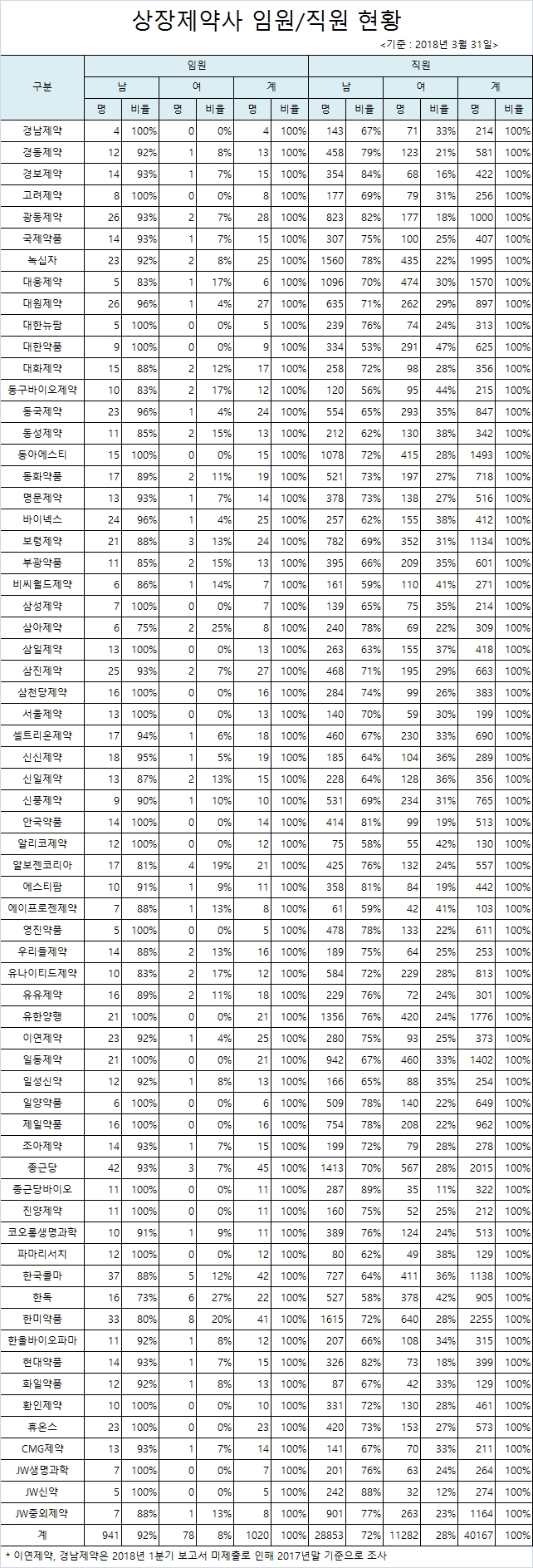 한편, 상장제약사 직원들의 남여 성비 비율은 72 : 28로 조사됐다. 3월말 현재 조사대상 65개 제약사의 총 직원 수는 4만 167명이었고, 이중 남성은 2만 8,853명, 여성은 1만 1,282명으로 집계됐다.