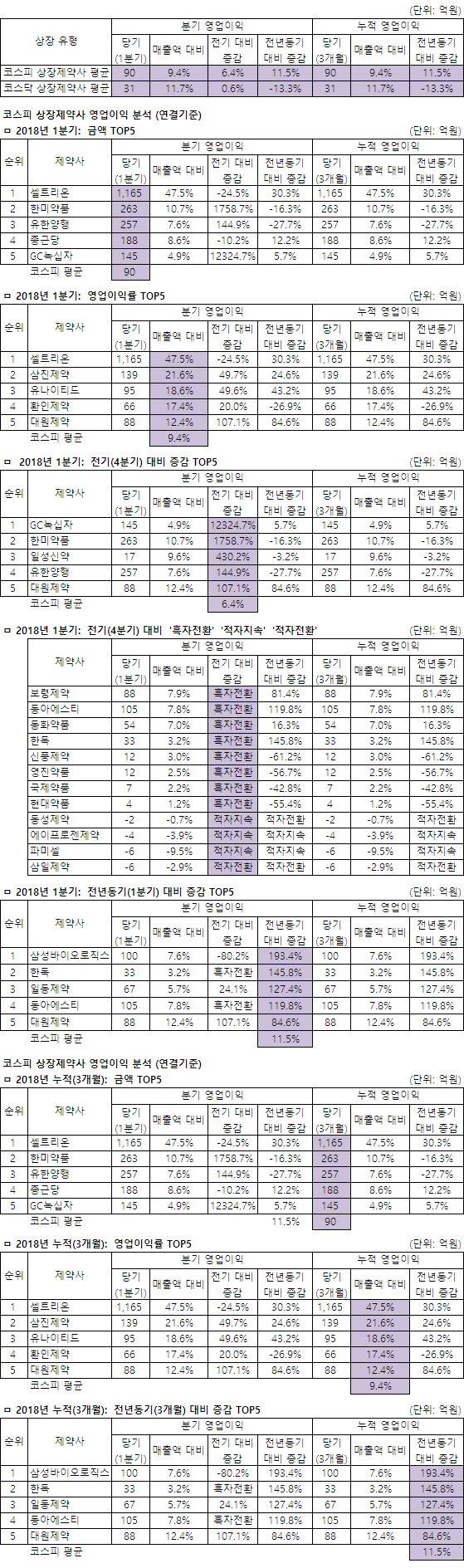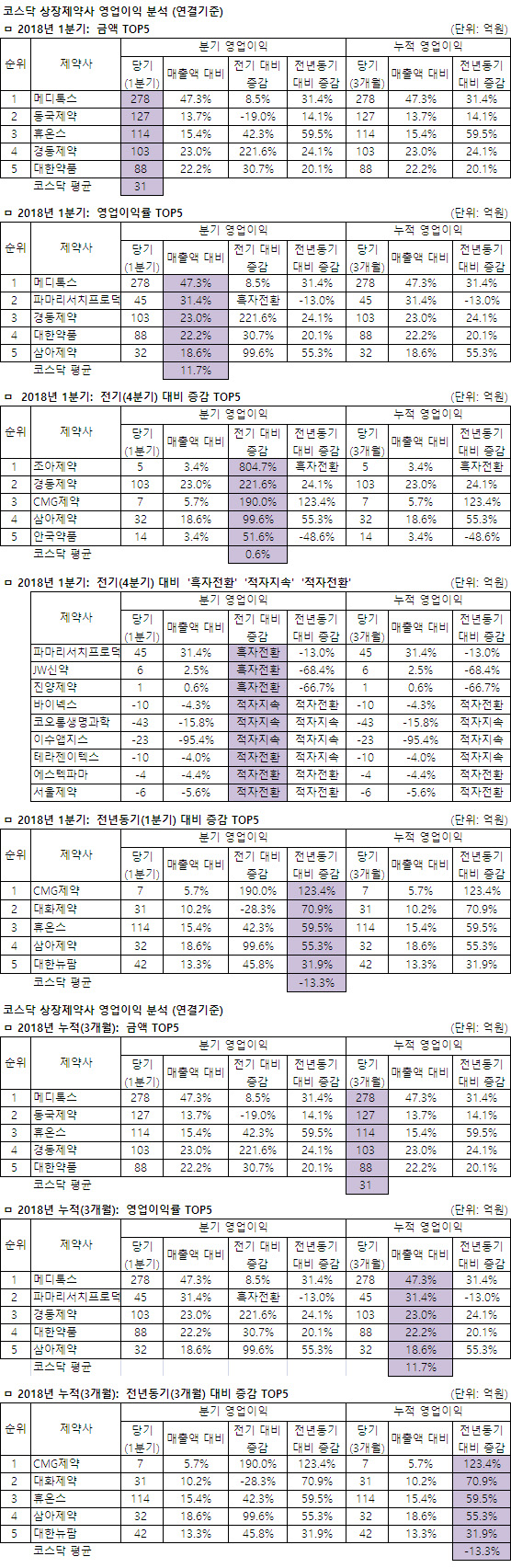 영업이익이 가장 많은 제약사는 코스피는 셀트리온 코스닥은 메디톡스, 매출대비 비중이 가장 높은 제약사는 코스피는 셀트리온 코스닥은 메디톡스, 전년동기대비 증감률이 가장 높은 제약사는 코스피는 삼성바이오로직스 코스닥은 CMG제약으로 각각 나타났다.